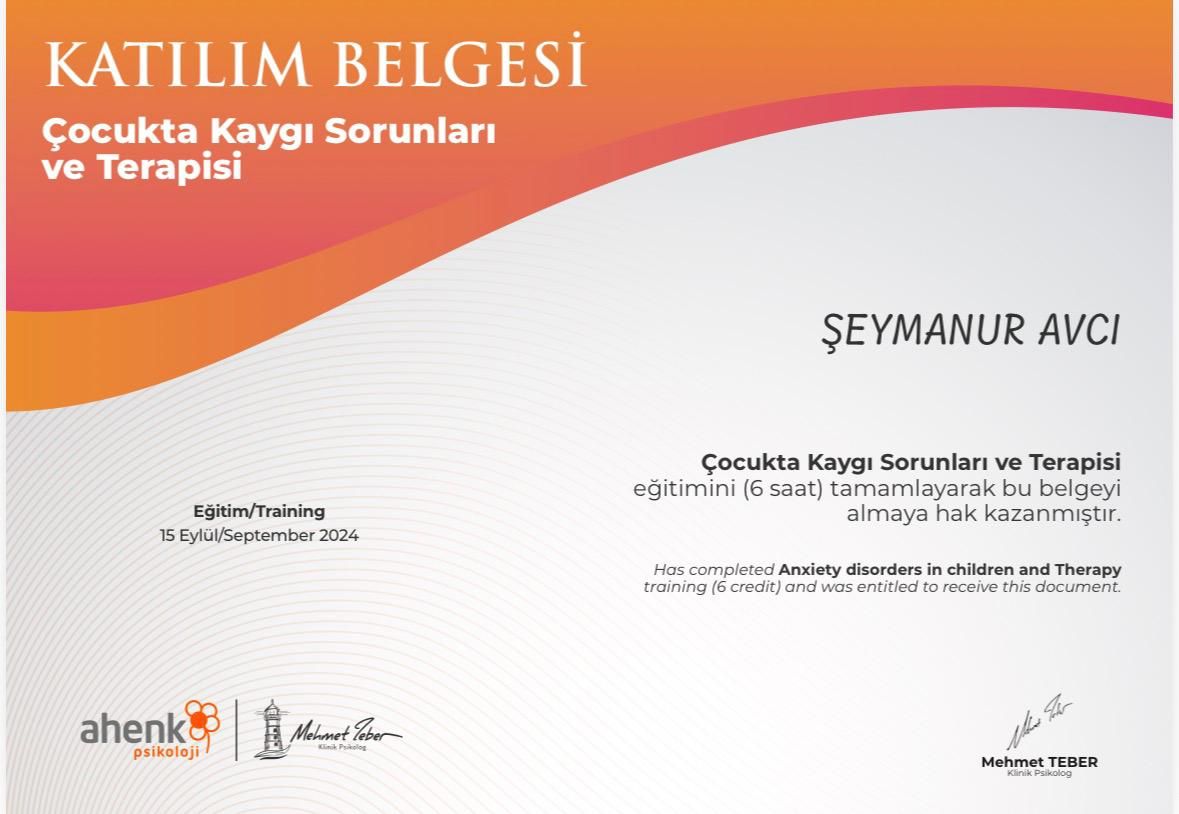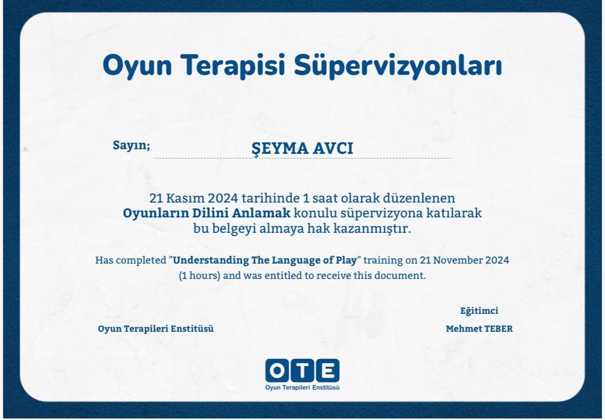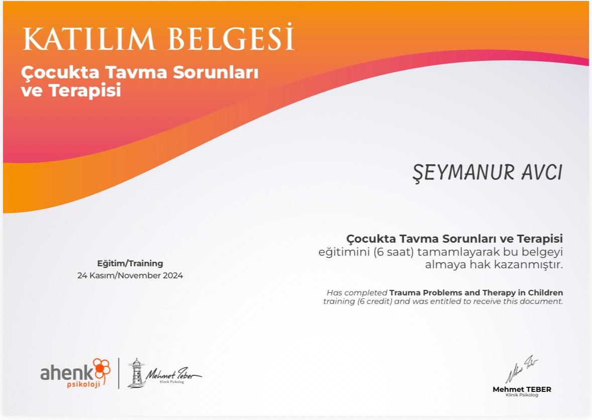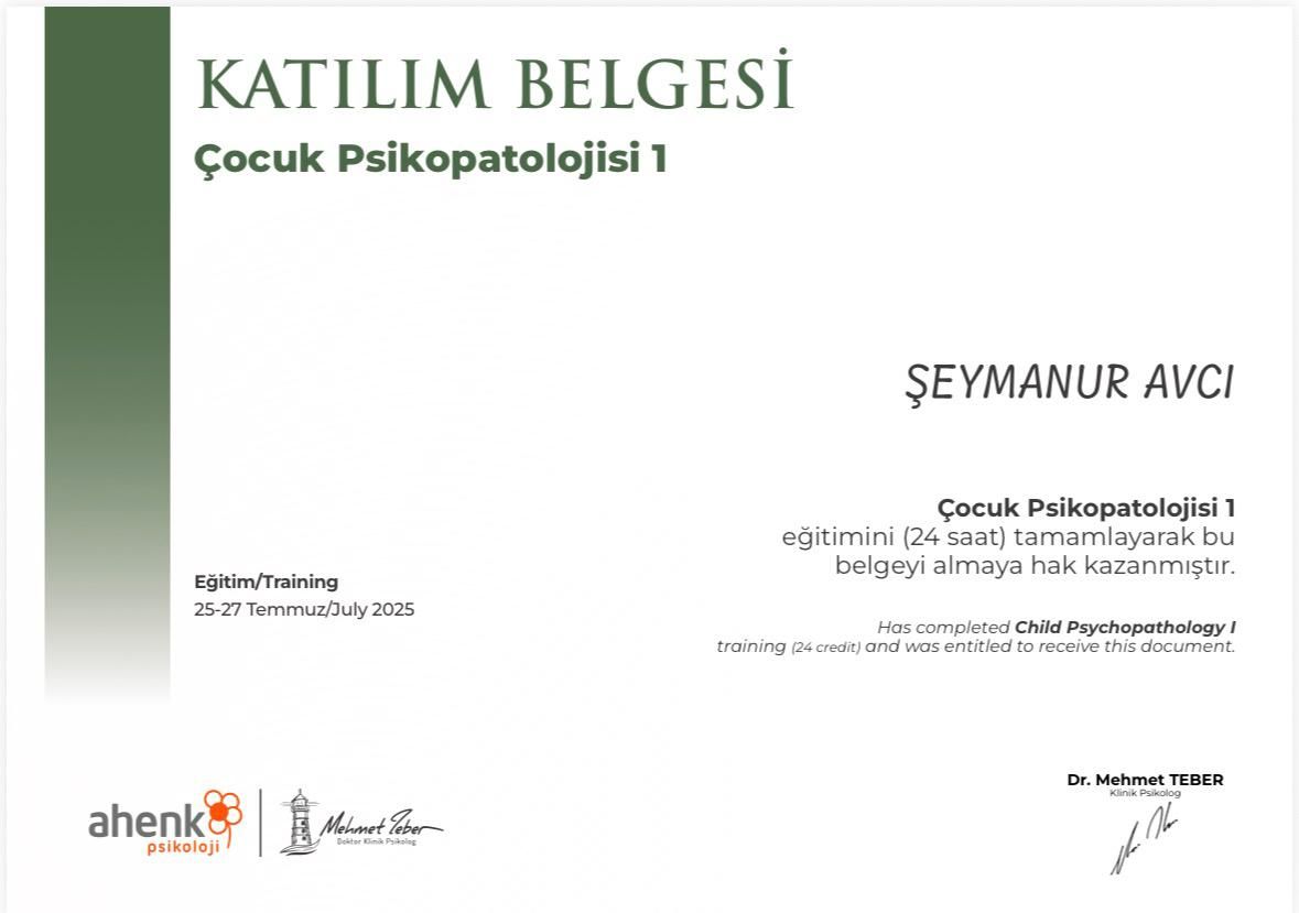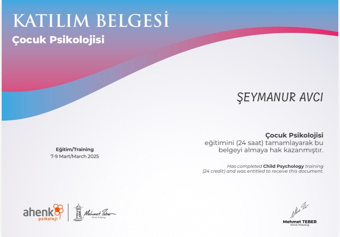 Mesleki hayatımda, çocuk psikolojisi ve çocuk gelişimi alanında eğitimler alarak çocuk ve aile odaklı çalışmalarım bulunmaktadır. Bu doğrultuda, alanında uzman hocalardan eğitimler alarak kendimi sürekli geliştirmekteyim. Şu anda 2-14 yaş arası çocuk ve ergenlerle çalışmalarımı sürdürüyorum.